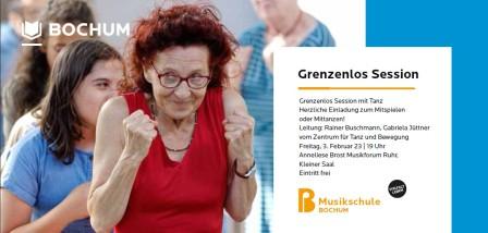 Wir laden ein zu gemeinsamen Kreistänzen mit dem generations- und nationalitätsübergreifende Weltmusik Ensemble „Grenzen.los“ | Tänzerische Leitung Gabriela Jüttner, Dipl.-Tanzpädagogin | Musikalische Leitung Rainer Buschmann, Musikschule Bochum | Termin Sonntag, 03.02.23, 19 - 21 Uhr | Ort Anneliese Brost Musikforum Ruhr, Bochum |
